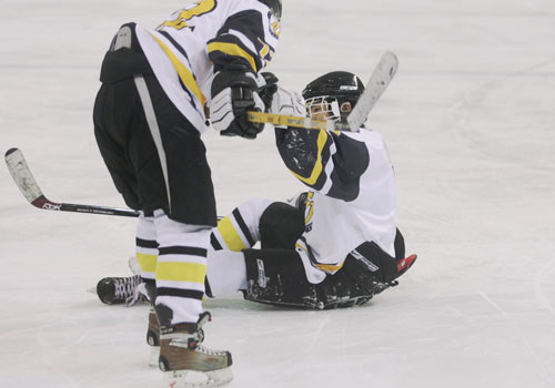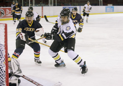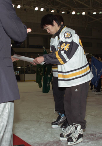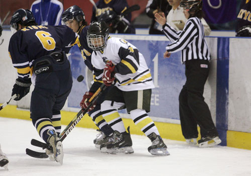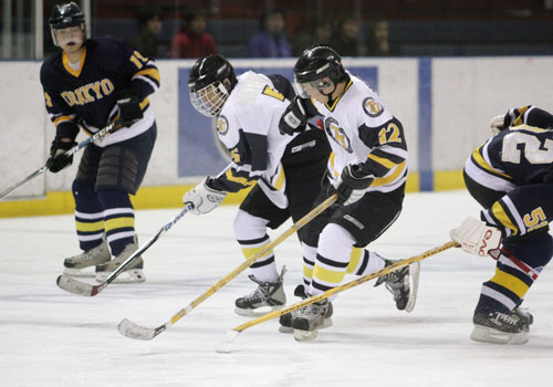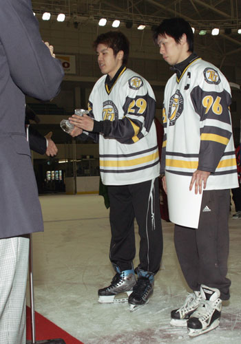 第3ピリオド10分、佐藤が相手陣内ブルーライン上で相手選手を