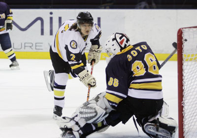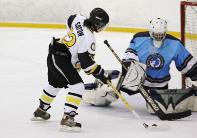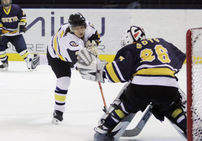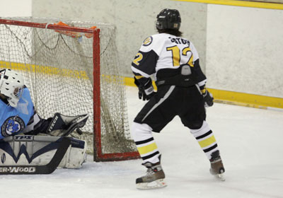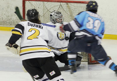 第2ピリオド9分、#12佐藤がパックをキープしゴール左から正面至近に踏み込む (続く)#12佐藤は相手GKを引きつけ、ゴール右からシュートを決める