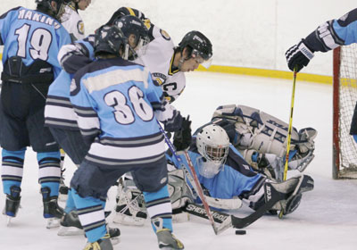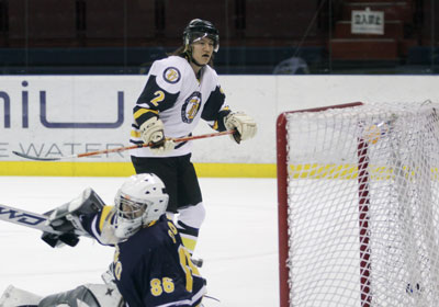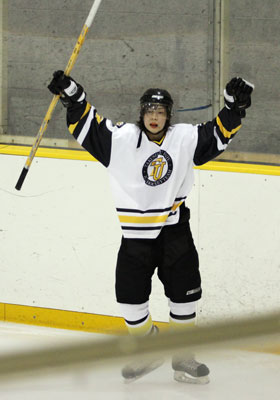 (続く)第2ピリオド9分26秒、拓大の先制ゴールに喜ぶ#12佐藤