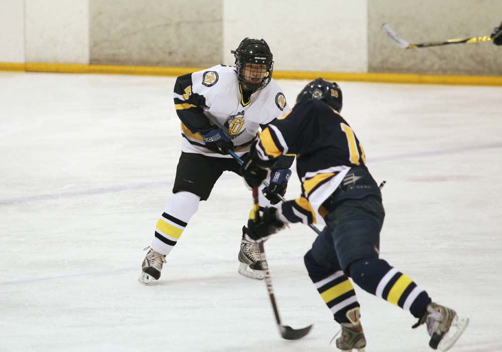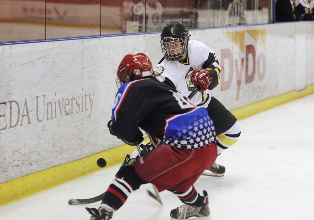 第1ピリオド、#5保科がセンターラインからダンプする相手選手をマークする