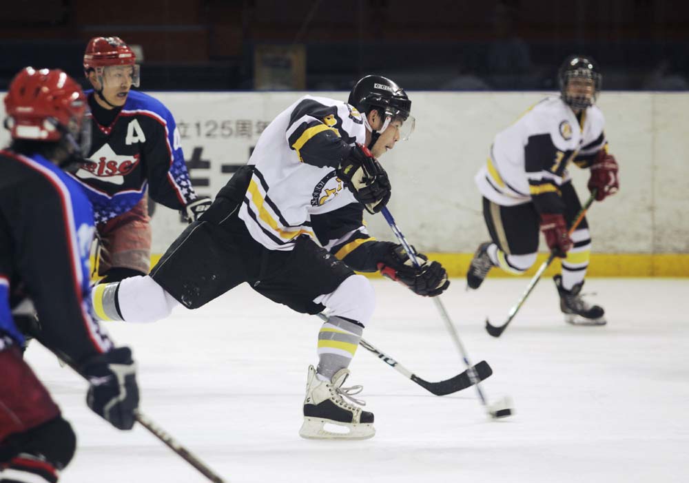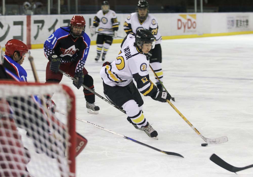 第3ピリオド13分、#4飯田雄樹が相手陣左リム付近でパックを奪ってゴール前の味方選手を探す
