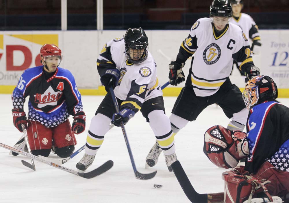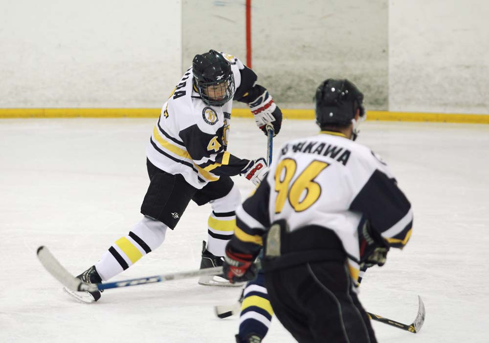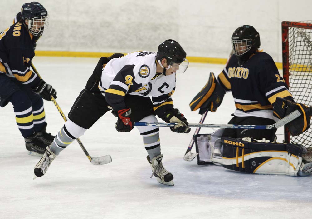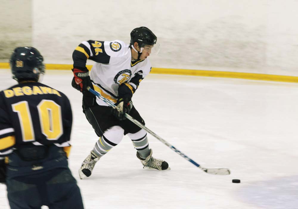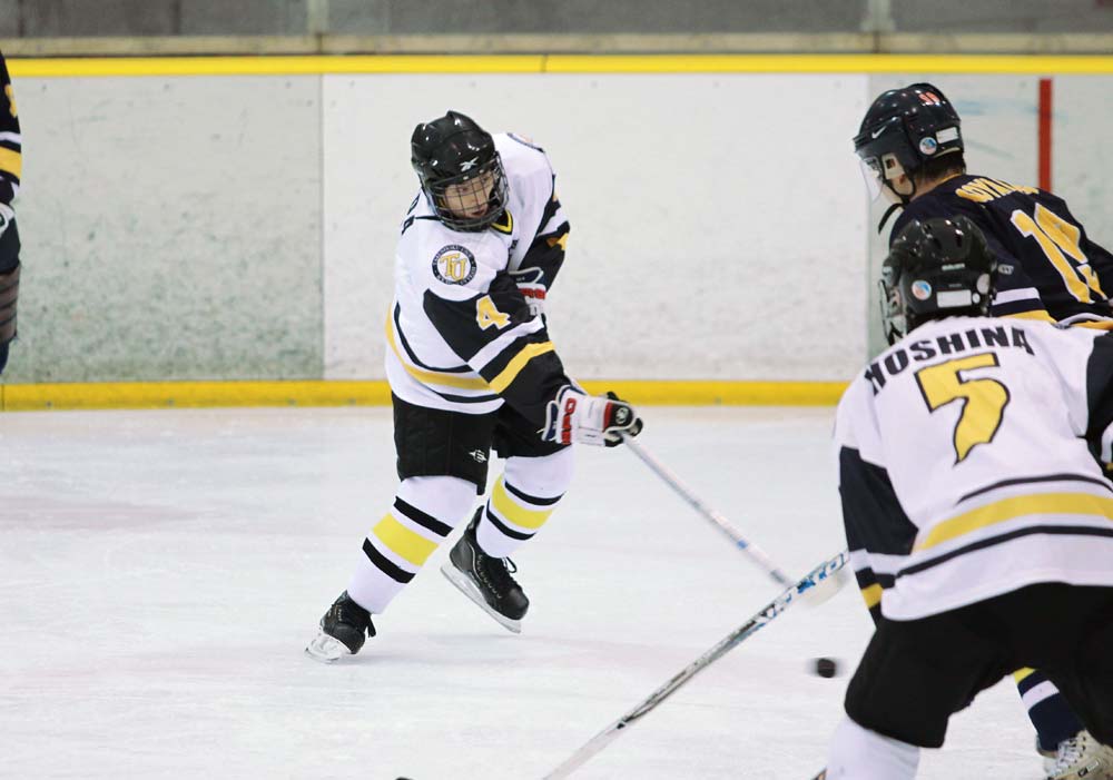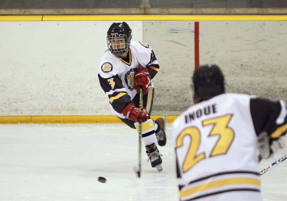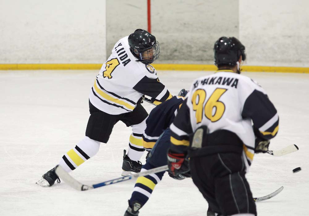 第3ピリオド9分、多重攻撃を仕掛ける拓大、ブロックショットされたパックが#4飯田雄樹の足もとにこぼれる