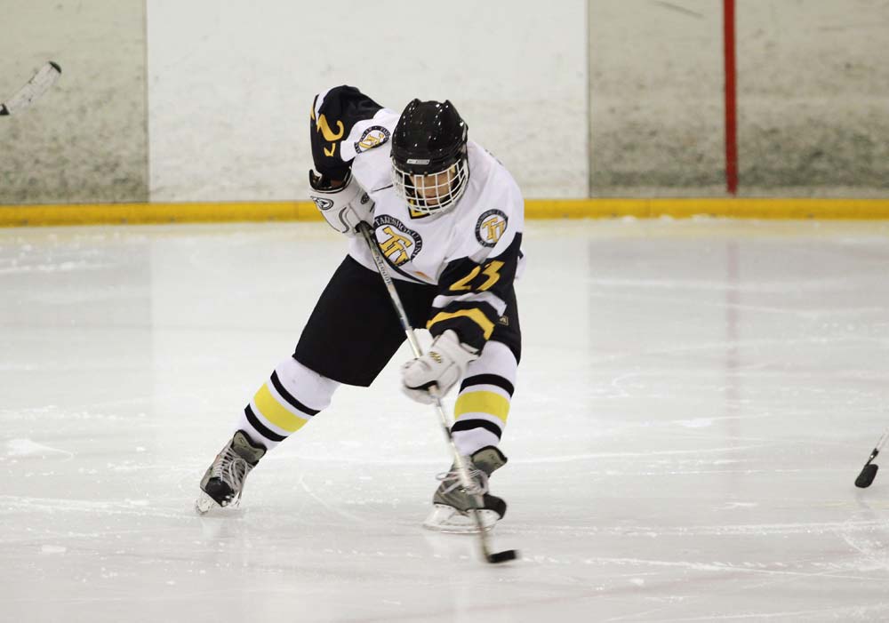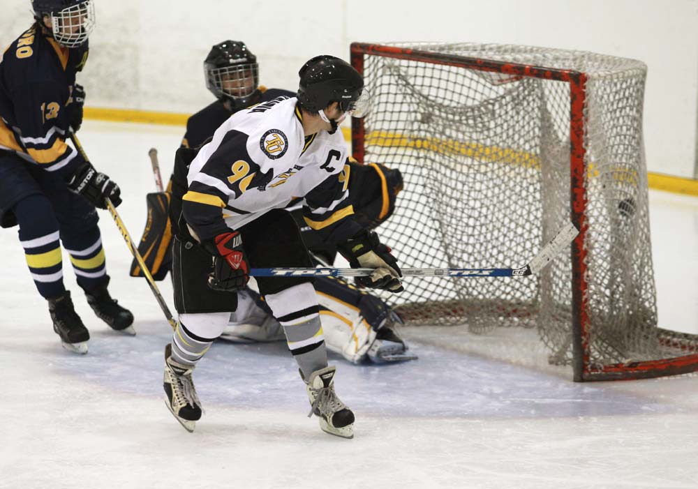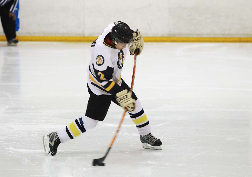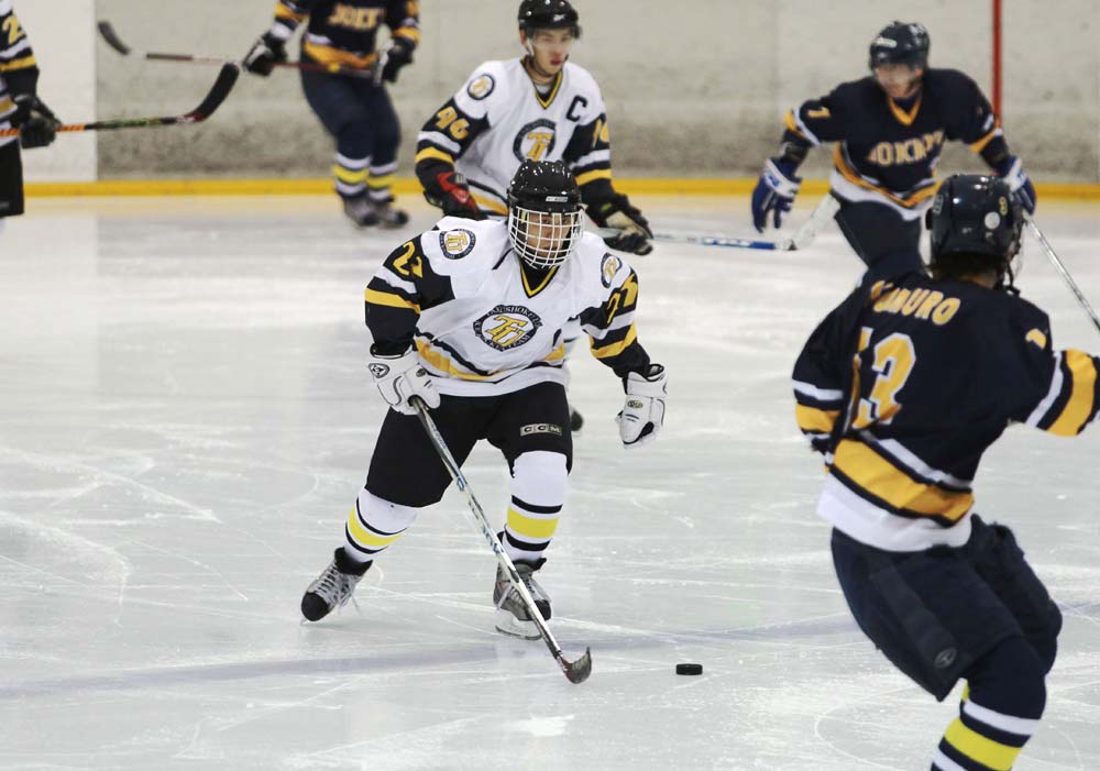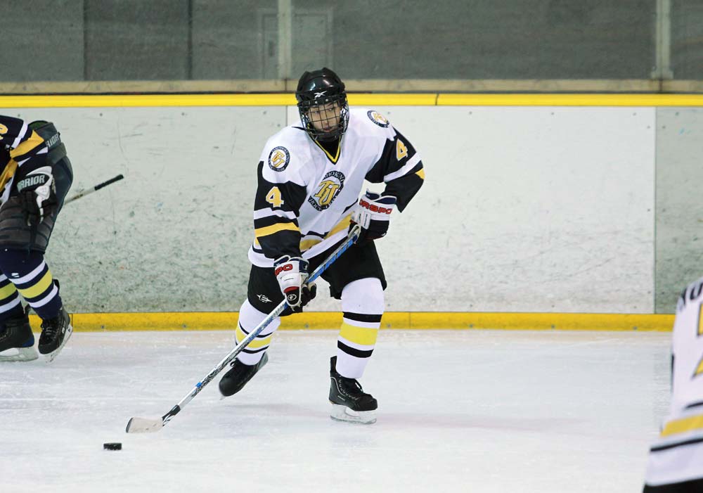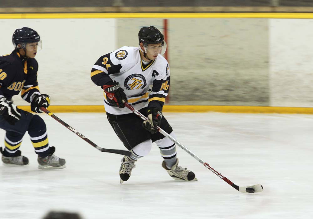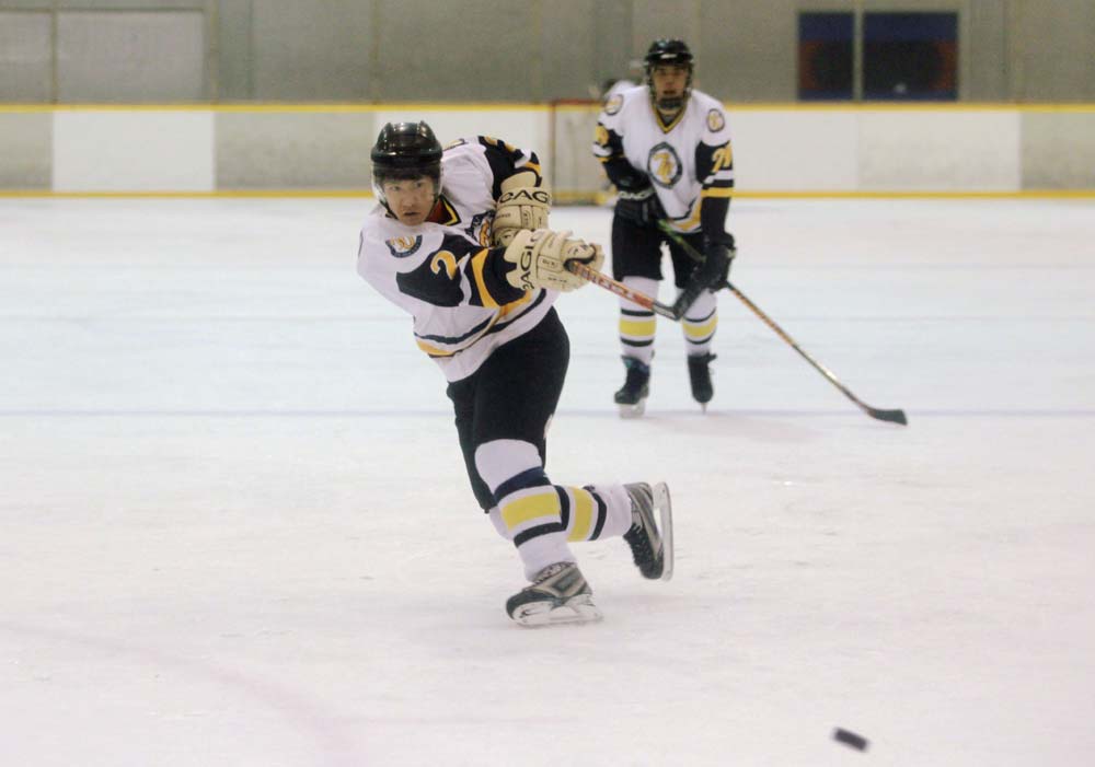 第3ピリオド9分、多重攻撃を仕掛ける拓大、ブロックショットされたパックが#4飯田雄樹の足もとにこぼれる