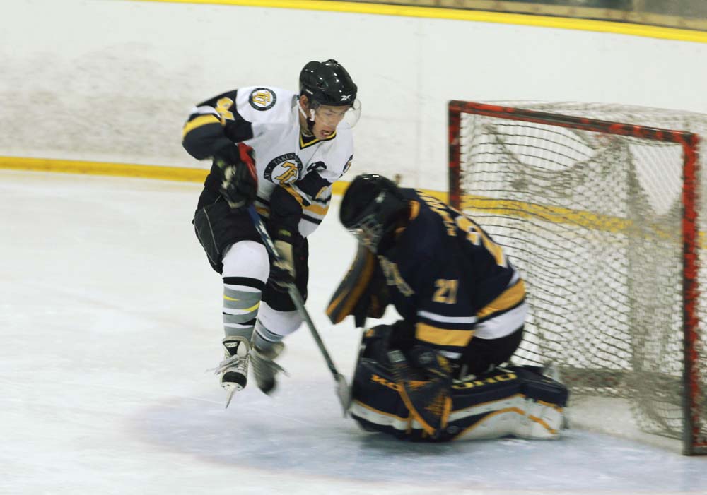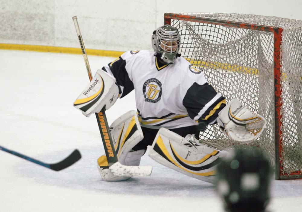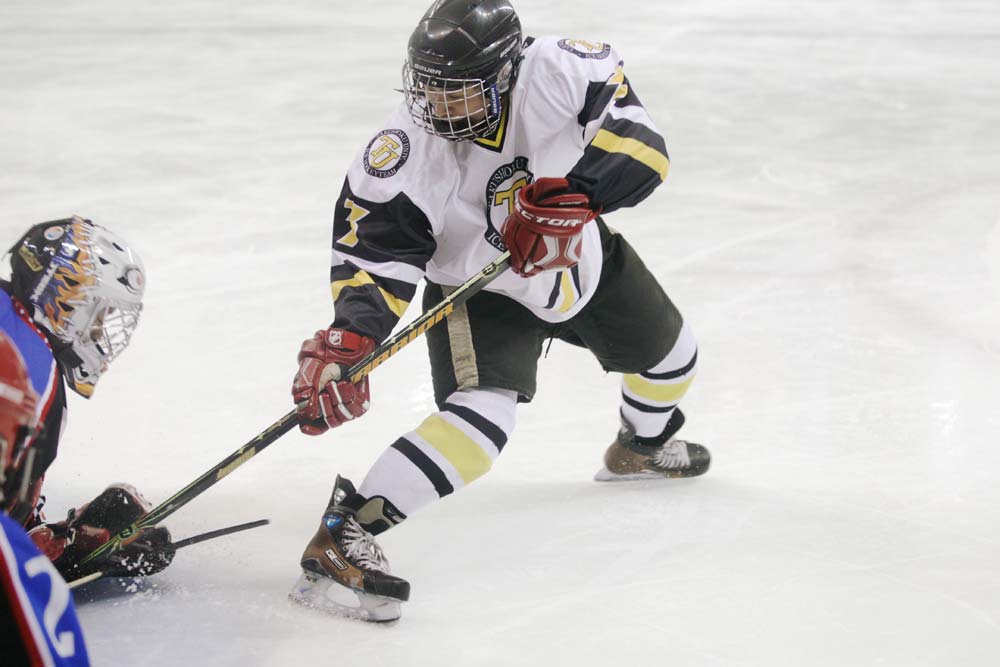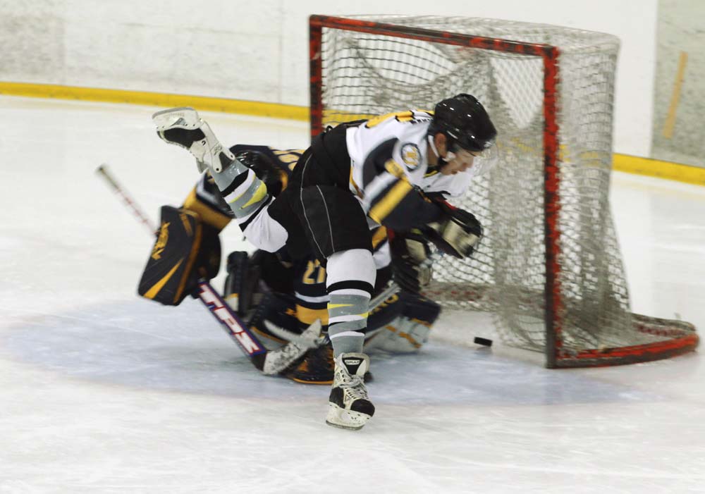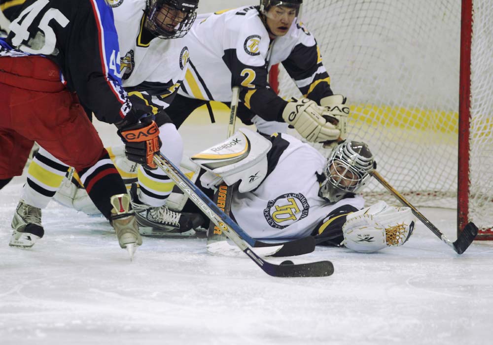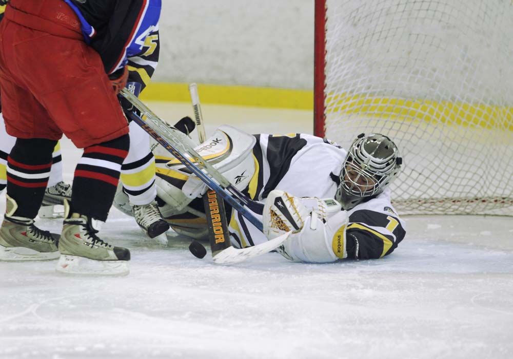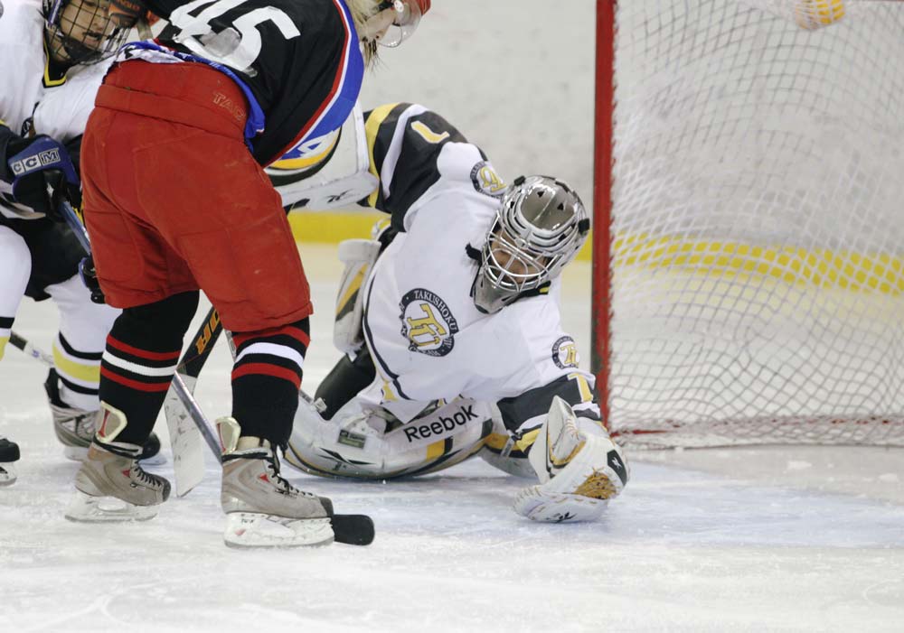 第2ピリオド3分、GK#1後藤がゴール前に打ち込まれたパックに反応する