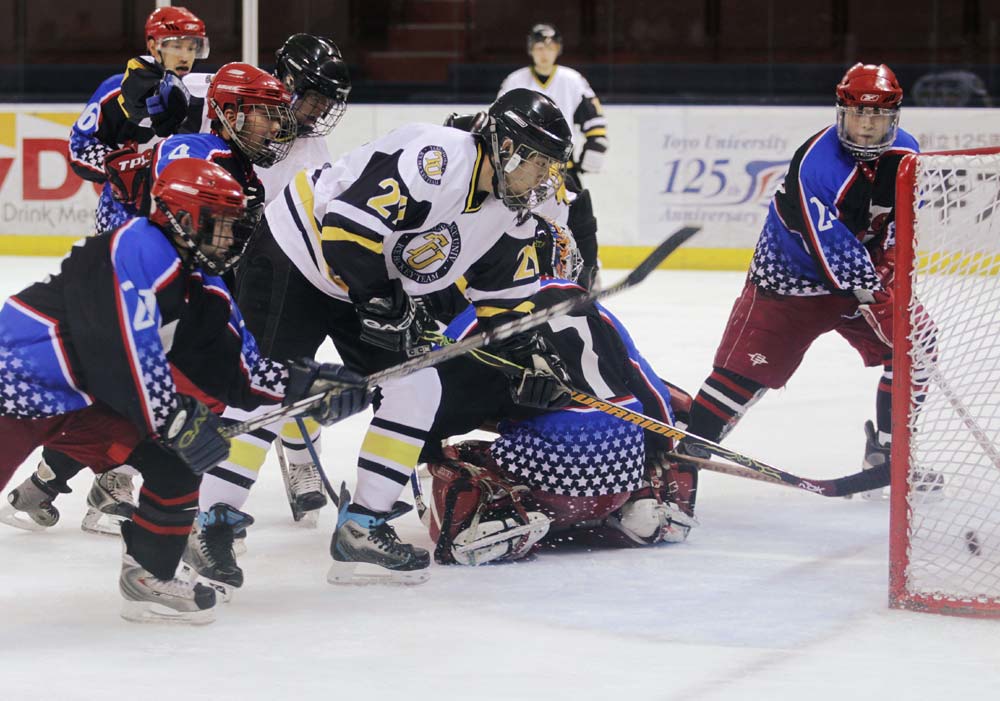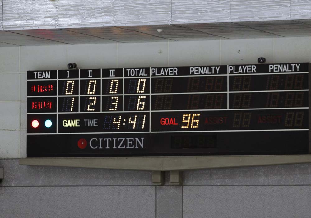 宮川がバランスを崩してゴール右脇に倒れこむが、パックはゴール内でラインを越える