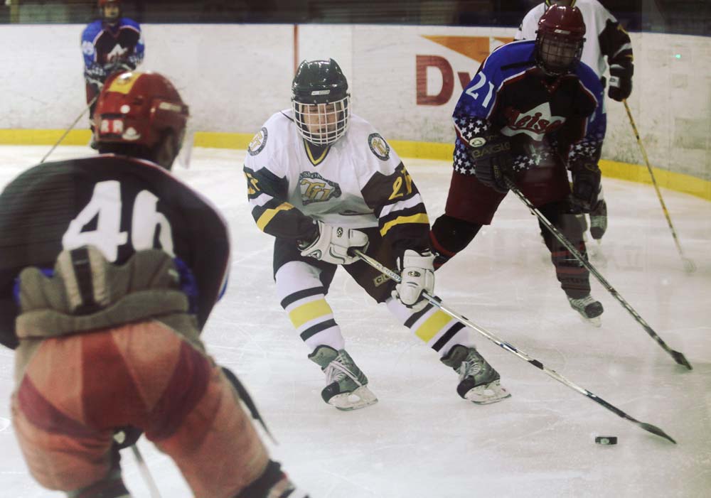 第3ピリオド0分、#23井上が自陣ブルーライン付近でパスをカットし自らキープして前進する